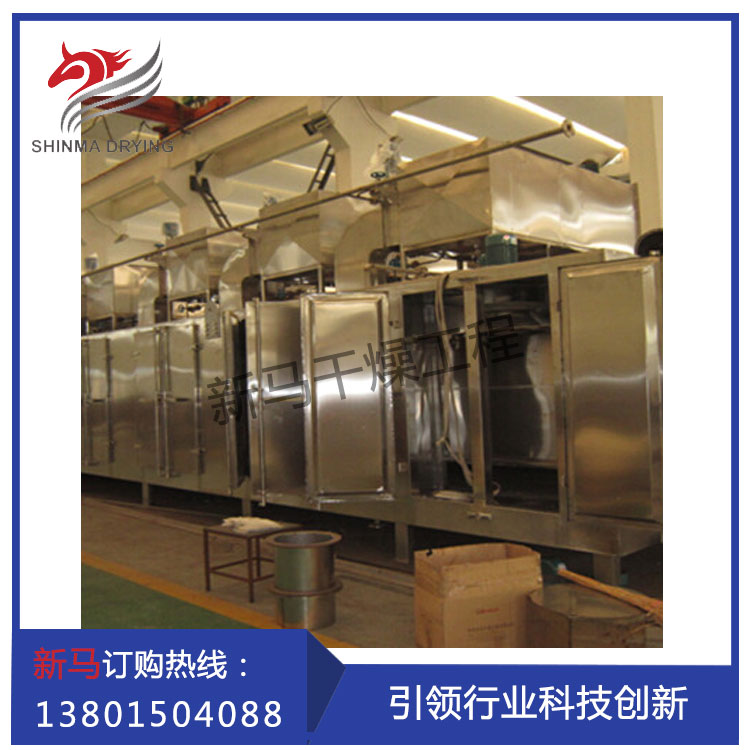整臺(tái)設(shè)備為全封閉型(對(duì)物料而言),加料系統(tǒng)、熱風(fēng)系統(tǒng)、出料系統(tǒng)和排濕系統(tǒng)五部分組成。加料段作用使物料均勻分散在網(wǎng)板上,并且勻速輸送到干燥段;熱風(fēng)系統(tǒng)是提供干燥所需的熱源,提供約150℃熱風(fēng)至干燥室;在輸送帶通過(guò)時(shí),熱空氣從上往下或從下往上通過(guò)輸送帶上的物料,從而使物料能均勻干燥,由出料段排出。